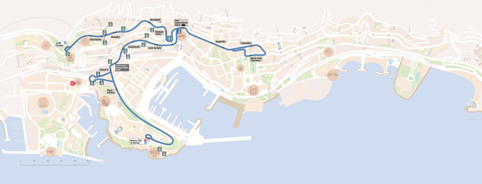 RETOUR : JARDIN EXOTIQUE – Bd Jardin Exotique - Pont Ste-Dévote - Bd. Psse Charlotte - Av. Saint-Michel - Casino Tourisme - Carrefour de la Madone - Crémaillère – Bd Psse Charlotte - Pont Ste-dévote - Bd. Rainier III – Rue de la Colle – Place d'Armes – MONACO-VILLE.