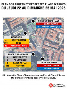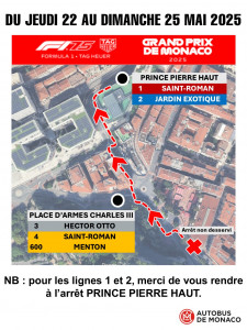 A l'occasion du 82ème Grand-Prix de F1 de Monaco qui se tiendra du jeudi 22 au dimanche 25 mai 2025, les lignes urbaines seront déviées selon les itinéraires ci-dessous :