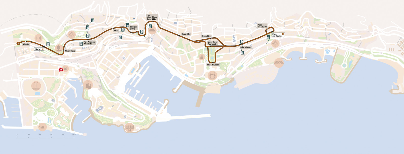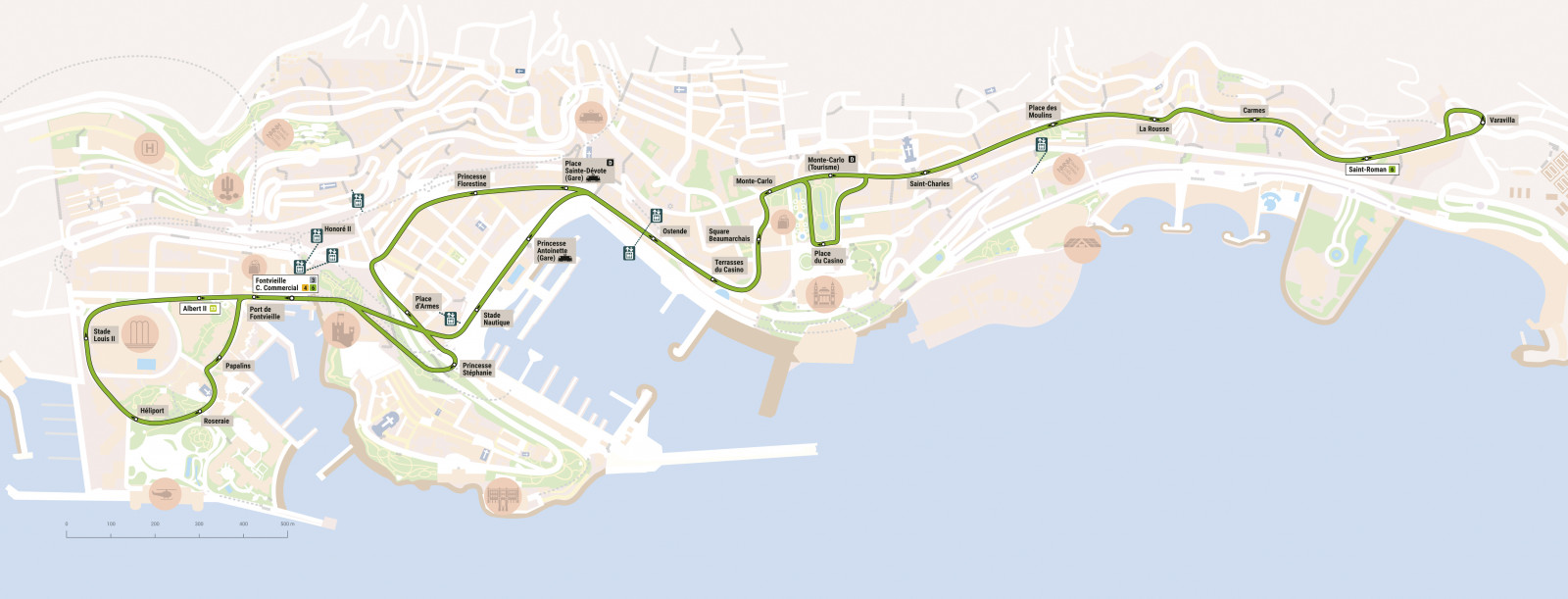 RETOUR : PLACE DES MOULINS – Bd des Moulins – Giratoire de la Madone – Avenue de la Madone – desserte arrêt PLACE DU CASINO puis itinéraire normal jusqu’à HOPITAL.
